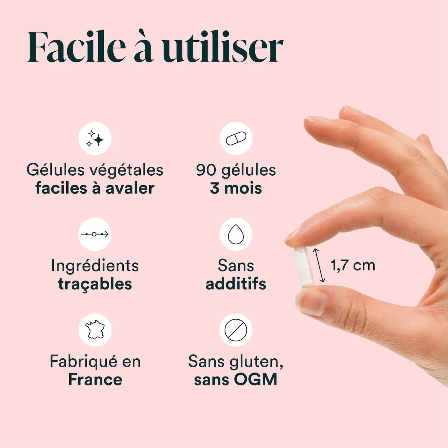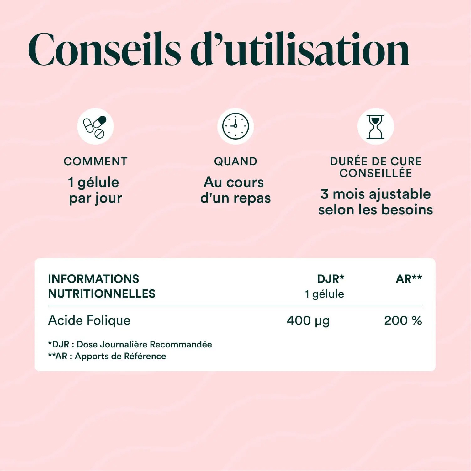 Chaque gélule contient 400 μg d’acide folique, offrant un apport optimal pour répondre aux besoins de l’organisme.