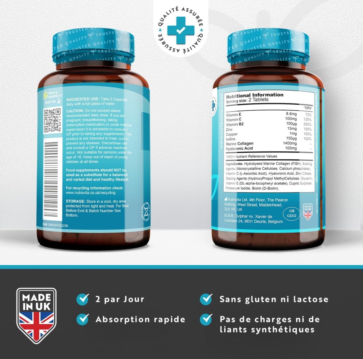 Notre formulation améliorée de collagène marin est mélangée avec de l’acide hyaluronique hydratant et des vitamines C & E qui contribuent à la formation normale de collagène pour un fonctionnement normal de la peau, des os, des vaisseaux sanguins et pour une protection normale des cellules contre le stress oxydatif (allégations étayées par l’EFSA).