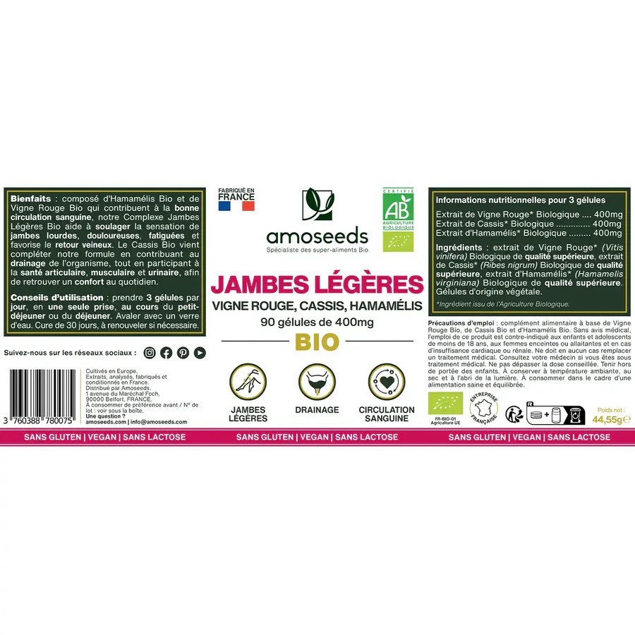 Formulé à partir d’extraits biologiques de Vigne Rouge, de Cassis et d’Hamamélis de grande qualité, ce complexe est idéal pour toutes les personnes qui souhaitent venir à bout de la sensation de jambes lourdes et gonflées, mais aussi pour celles qui veulent améliorer leur circulation sanguine et leur retour veineux.