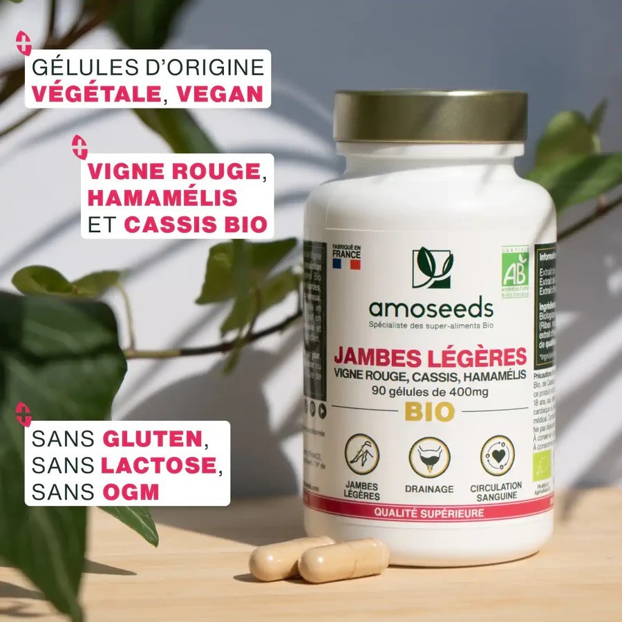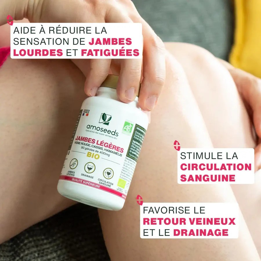 - JAMBES LOURDES : en favorisant la bonne circulation sanguine et le retour veineux, les feuilles de Vigne Rouge Bio et d’Hamamélis Bio contenues dans notre complexe permettent de retrouver un confort au quotidien et des jambes légères. En effet, ces deux plantes sont reconnues pour contribuer au soulagement des sensations de jambes lourdes, douloureuses et fatiguées. Associées ici dans notre complexe Bio, elles seront idéales en cas de forte chaleur pour limiter le gonflement des jambes, mais aussi pour les personnes qui souhaitent gagner en légèreté, notamment celles qui passent de longues périodes debout ou en position assise.