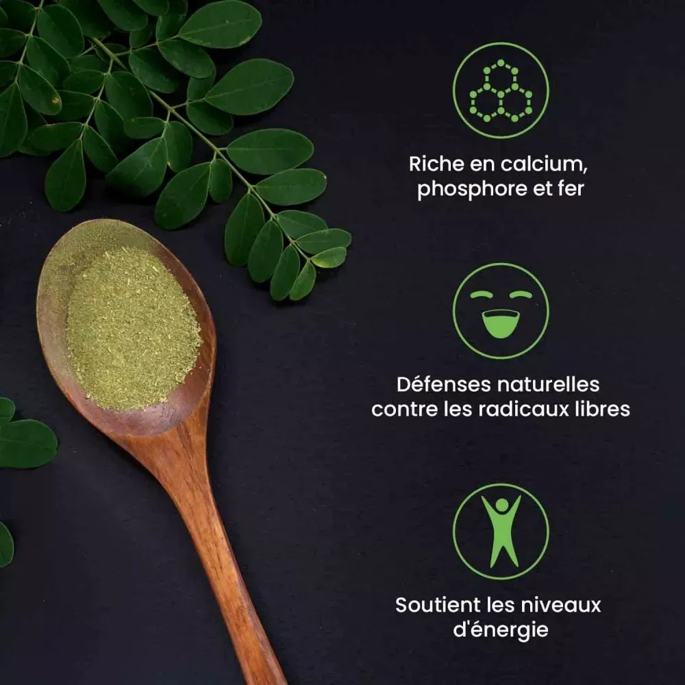 Le moringa (Moringa oleifera), souvent appelé « arbre miracle », est une plante tropicale célèbre pour sa concentration naturelle en nutriments et son utilisation traditionnelle dans les pratiques de bien-être.