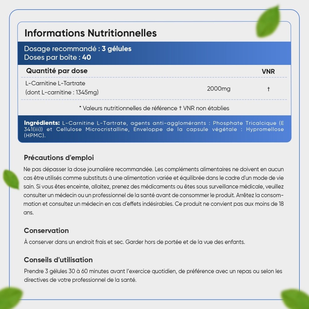 La L-Carnitine est un acide aminé naturellement présent dans le corps, crucial pour le métabolisme des graisses et la production d’énergie. Elle aide en effet à transporter les acides gras vers les mitochondries, les “centrales énergétiques” des cellules, où ces graisses sont converties en énergie.