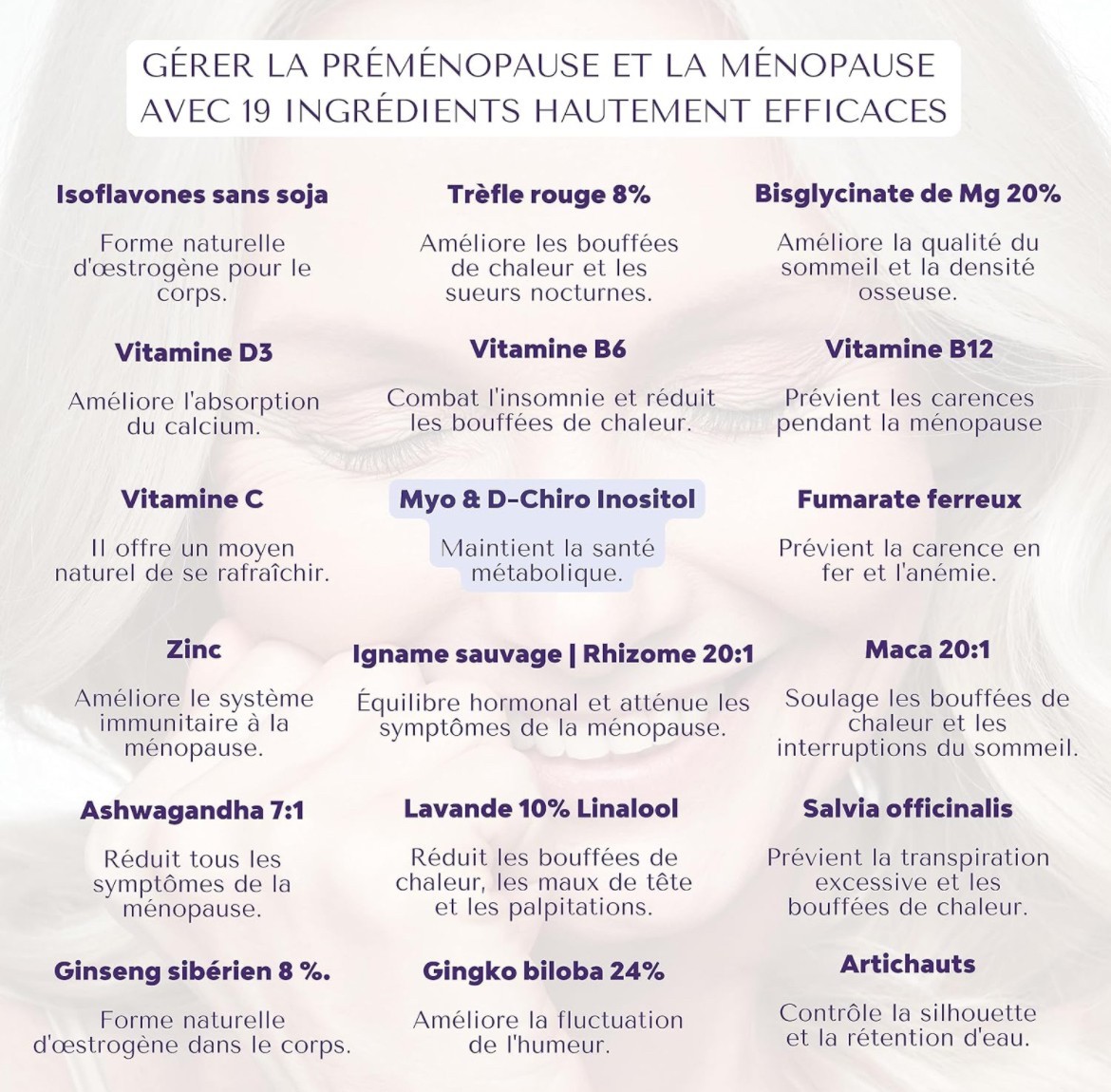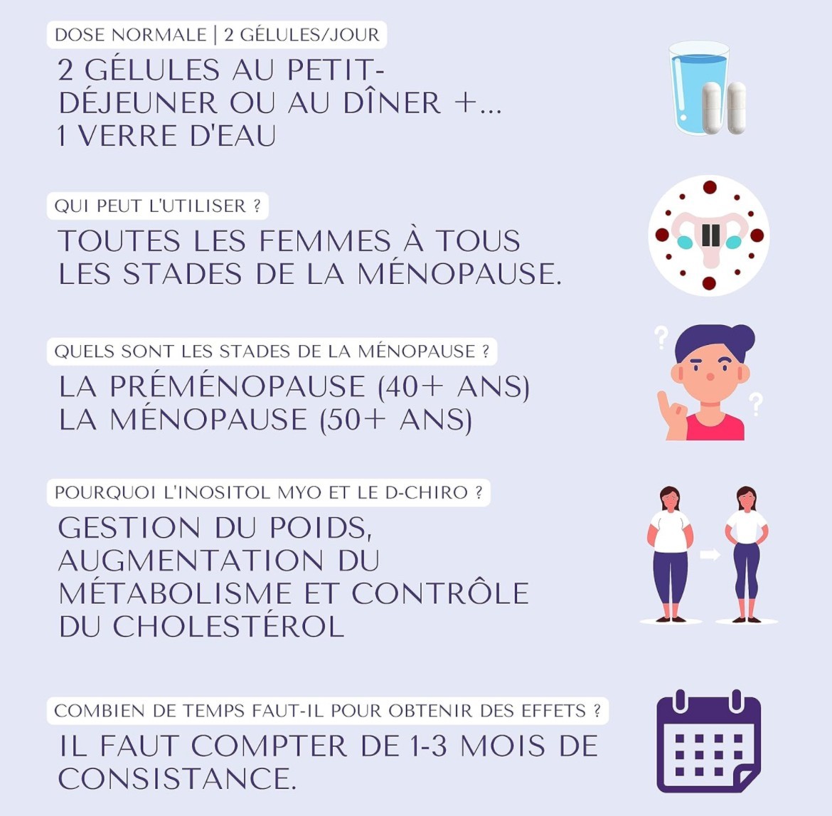 Myo-Inositol & D-Chiro Ménopause est une formulation de 19 ingrédients de qualité:
