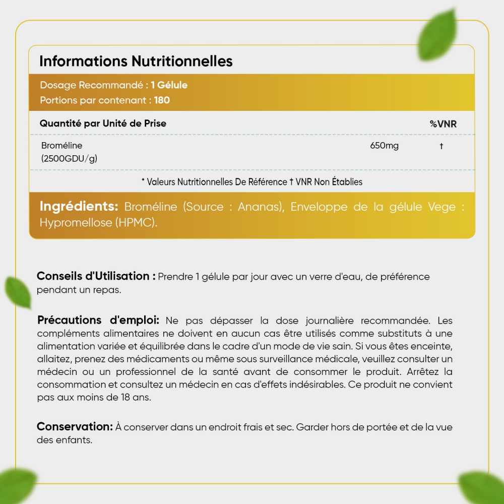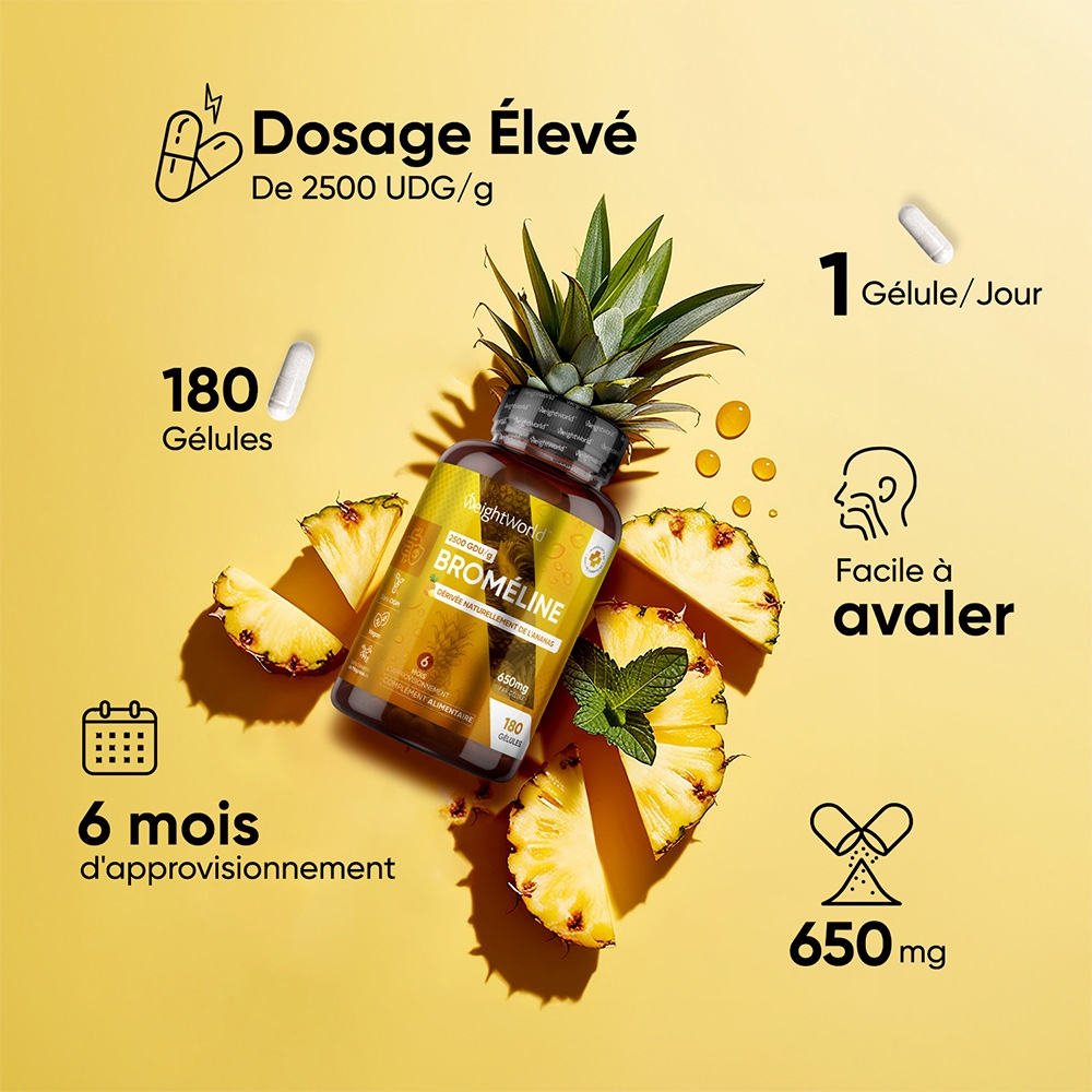 - Propriétés anti-inflammatoires : La bromélaïne a la capacité de diminuer l’inflammation et le gonflement en bloquant la fabrication de composés pro-inflammatoires, ce qui en fait un soutien potentiel pour le traitement de pathologies inflammatoires de longue durée telles que l’arthrite.